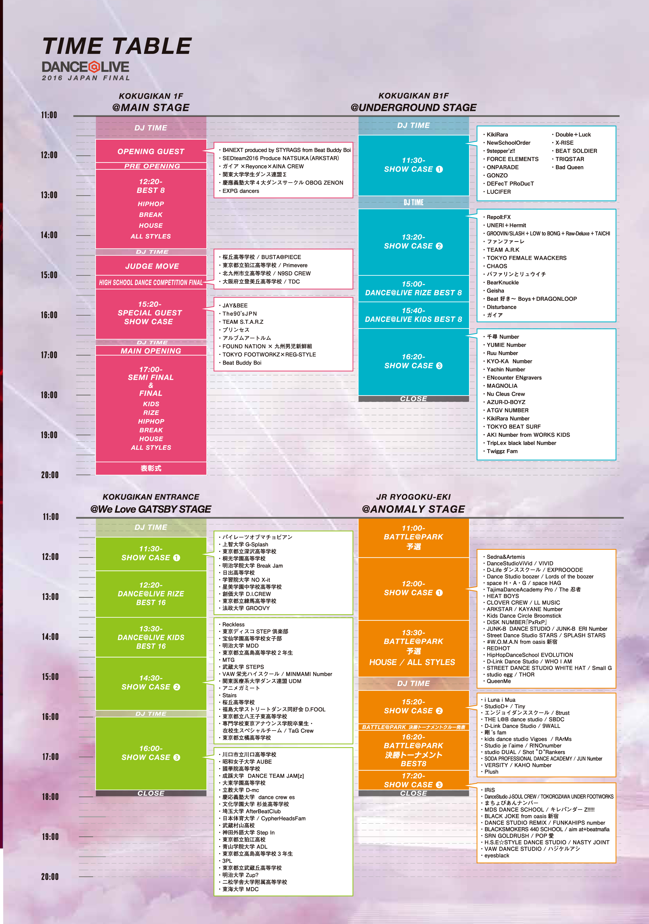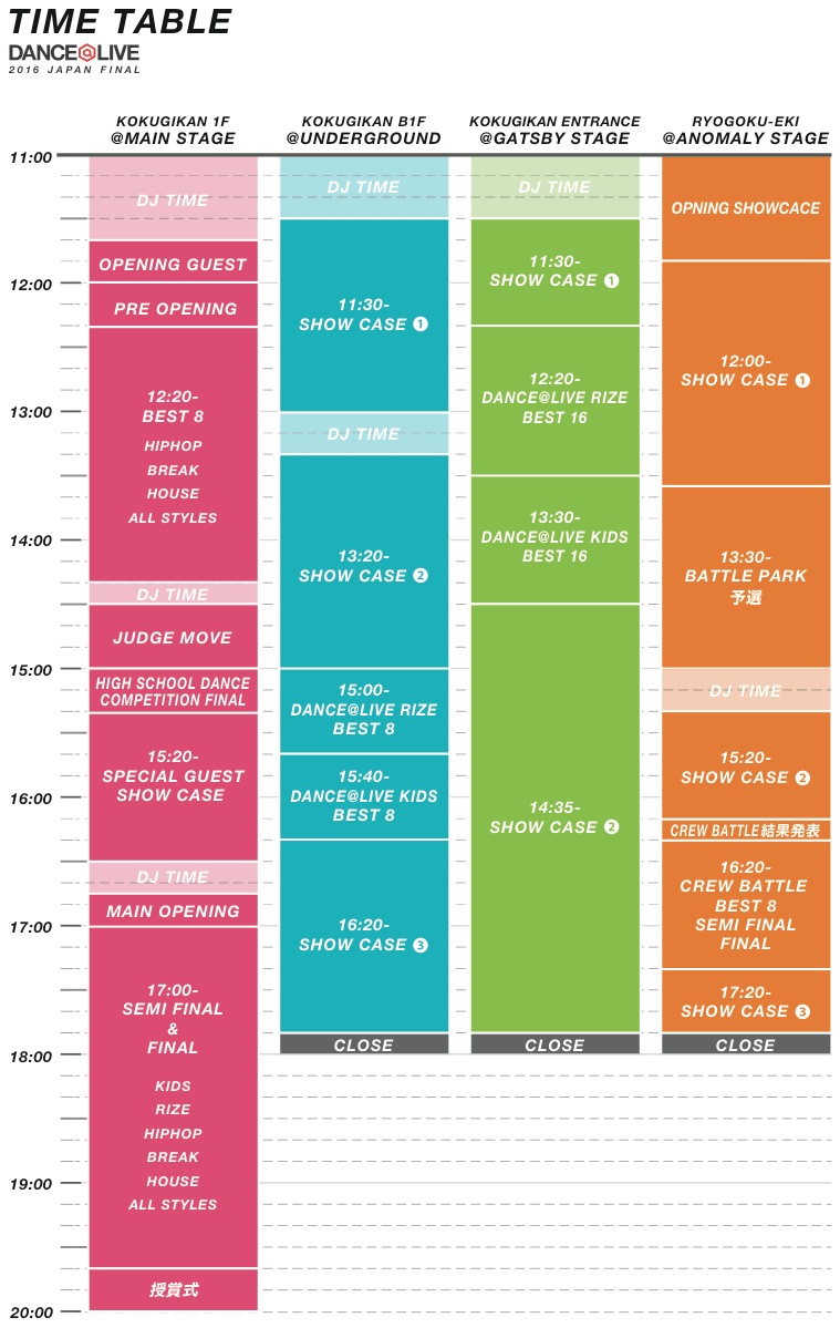 1on1形式を基本とした世界最大規模のストリートダンスバトル「DANCE@LIVE」。 各地区で合計80回近く開催される予選を勝ち抜いてきたポイントランキング上位者のみが上がれる決勝の舞台。 それが「DANCE@LIVE JAPAN FINAL」。 ダンスバトルの他にも様々なステージで豪華GUEST SHOWCASEやCREW BATTLE、学生SHOWCASEなどが繰り広げられる年に一度のストリートダンスの祭典。